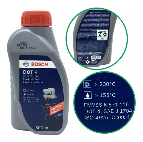 Composição: O Bosh DOT 4 é um fluido à base de glicol, o que significa que é miscível com outros fluidos à base de glicol, mas não deve ser misturado com fluídos DOT 5, que são à base de silicone, pois possuem propriedades diferentes.